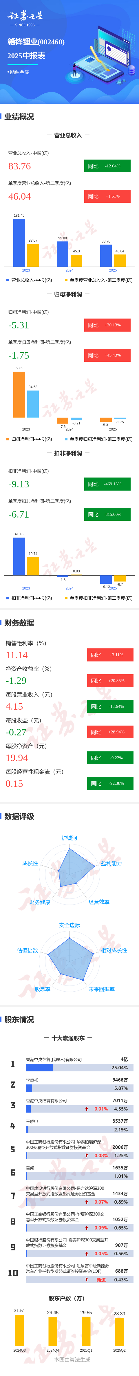 证券之星消息,赣锋锂业2025年中报显示,公司主营收入83.76亿元,同比下降12.65%;归母净利润-5.31亿元,同比上升30.13%;扣非净利润-9.13亿元,同比下降469.14%;其中2025年第二季度,公司单季度主营收入46.04亿元,同比上升1.62%;单季度归母净利润-1.75亿元,同比上升45.44%;单季度扣非净利润-6.71亿元,同比下降815.0%;负债率58.55%,投资收益3.14亿元,财务费用7.24亿元,毛利率11.14%。